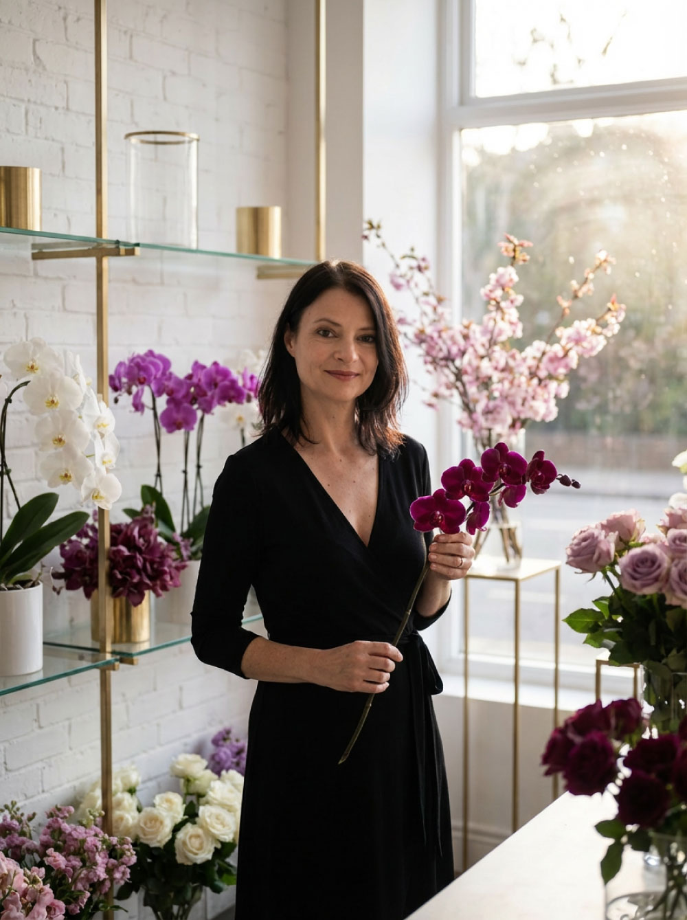Ich liebe stimmige Räume. Deshalb kaufe ich meine Orchideen und Blumentöpfe tatsächlich nur in meinen Brandfarben – Purpur, Aubergine oder Weiß. Meine Wohnung ist sozusagen die Offline-Version von Sparkle & Flow.